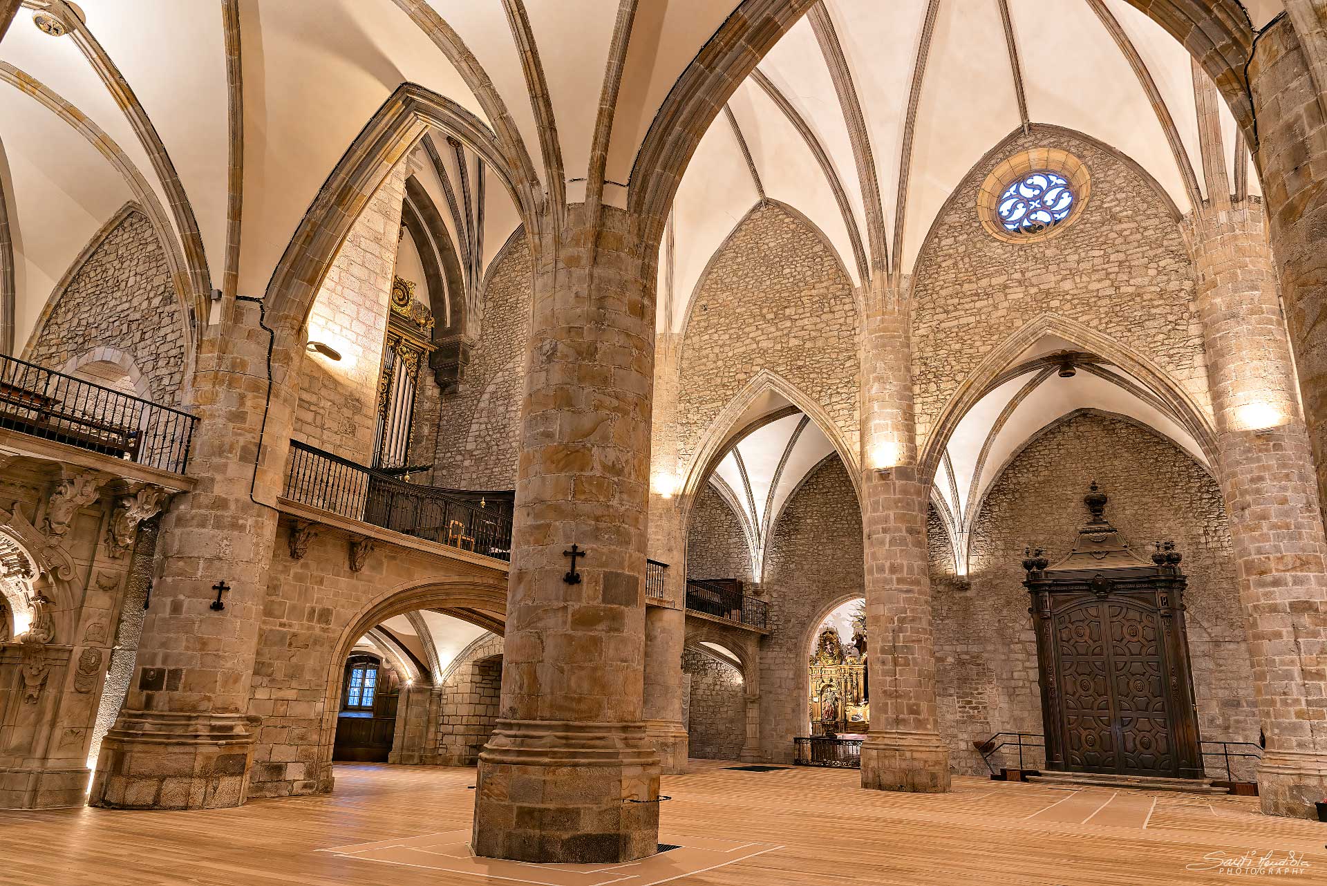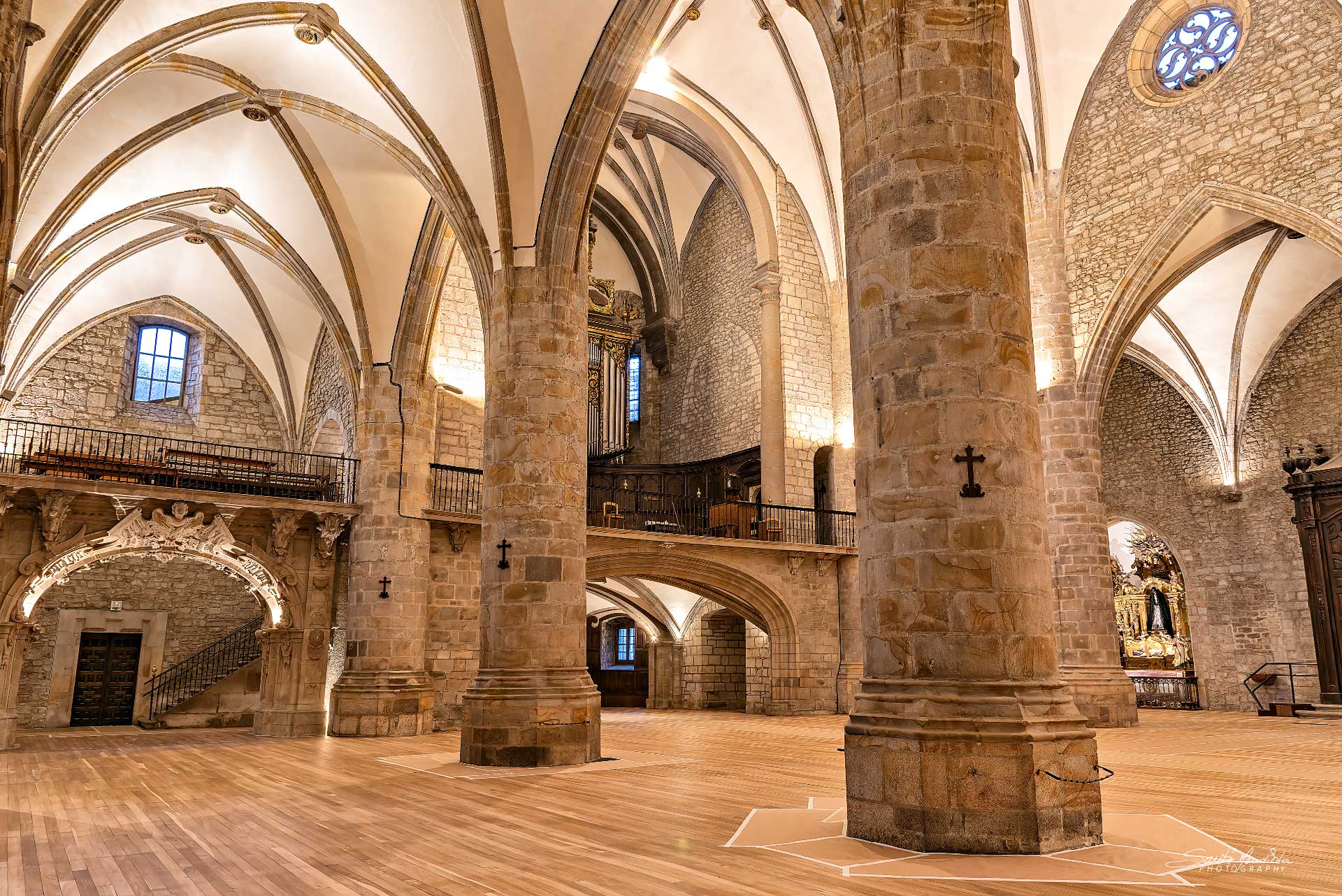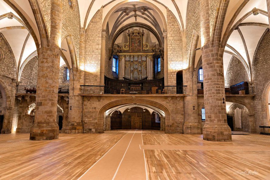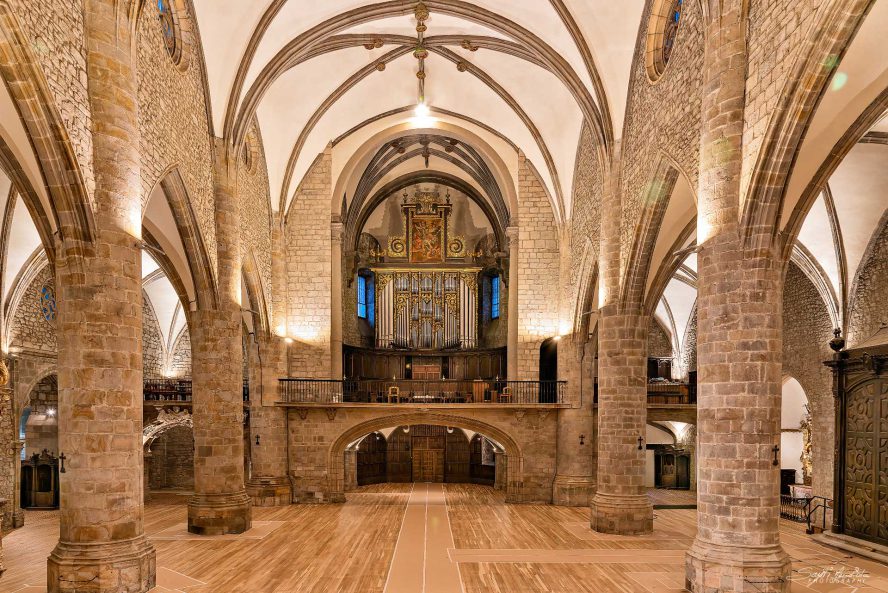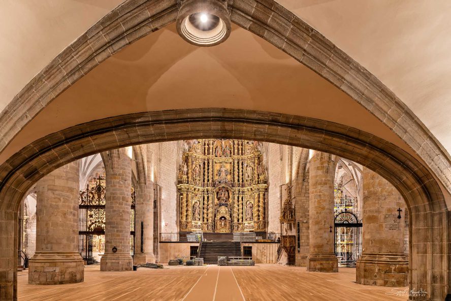 Templo vacío de bancos, después someterse a una renovación integral de su sistema de iluminación, limpieza del polvo del retablo.