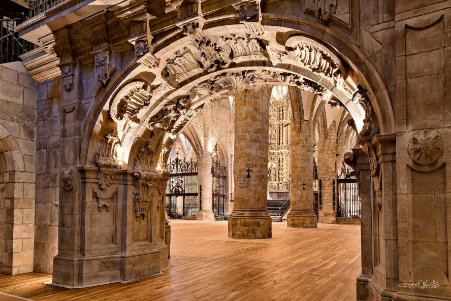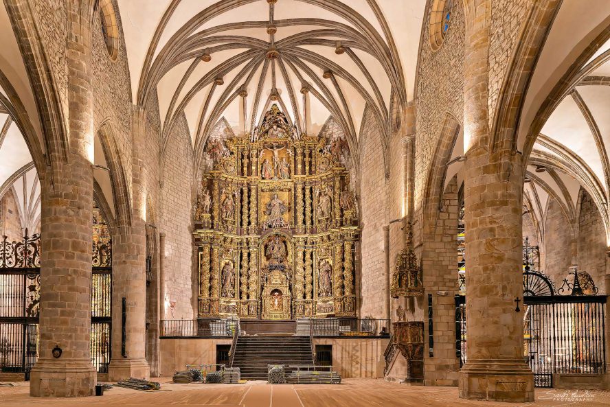 “Iglesia de San Miguel S.XV de estilo gótico, pose un espectacular claustro gótico florido del S.XVI; bajo el altar se encuentran los sepulcros góticos de los condes de Oñate. También en el templo se encuentra el sepulcro de Rodrigo Mercado de Zuazola (Fundador de la Universidad) obra de Diego de Siloé (S.XVI)”